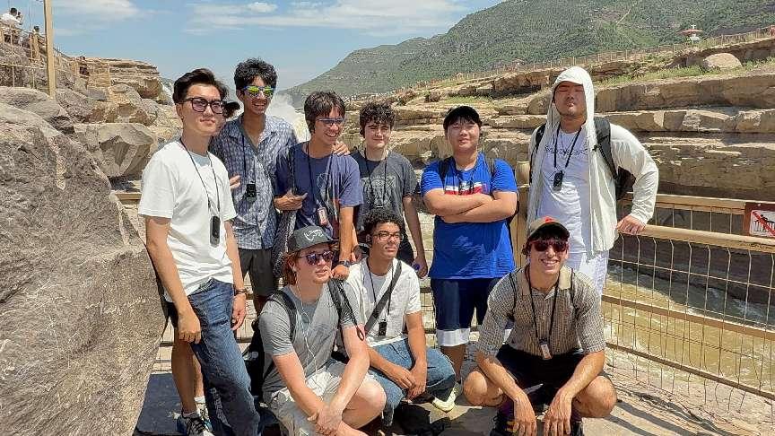 美国飞虎队友谊学校青少年研学团成员与918博天堂学生参观壶口瀑布合影
